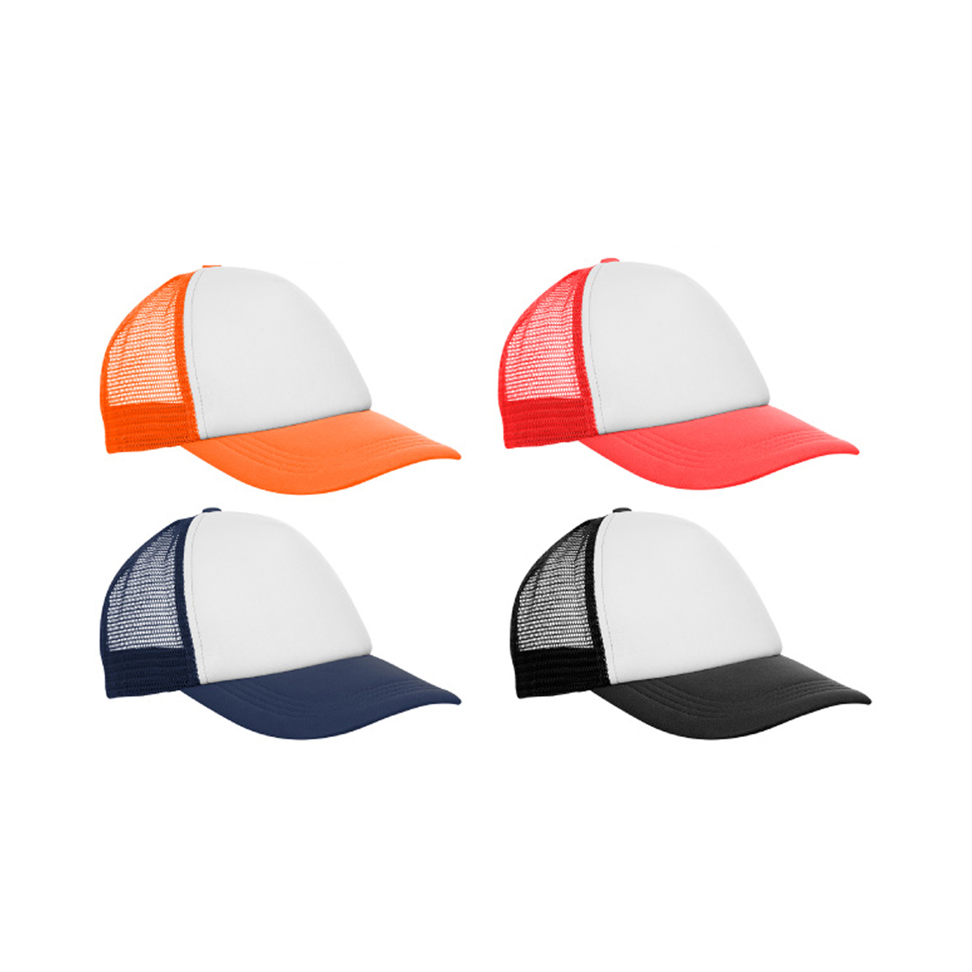 Ancho de base 18 cm. x alto 16 cm. Poliéster. Gorra trucker 5 gajos. Frente de color blanco. Parte trasera con tela red de color. Ajuste con broche plástico. Seis costuras 17,5 x 7,5 cm.
