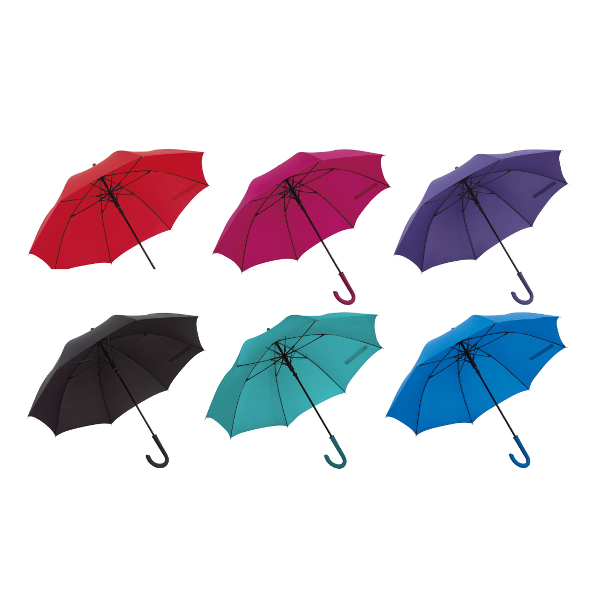 Ø103 cm. Aprox. Bastón metálico, varillas en fibra de vidrio, puntas metálicas y mango curvo de plástico. APERTURA AUTOMÁTICA. Con cierre de velcro.