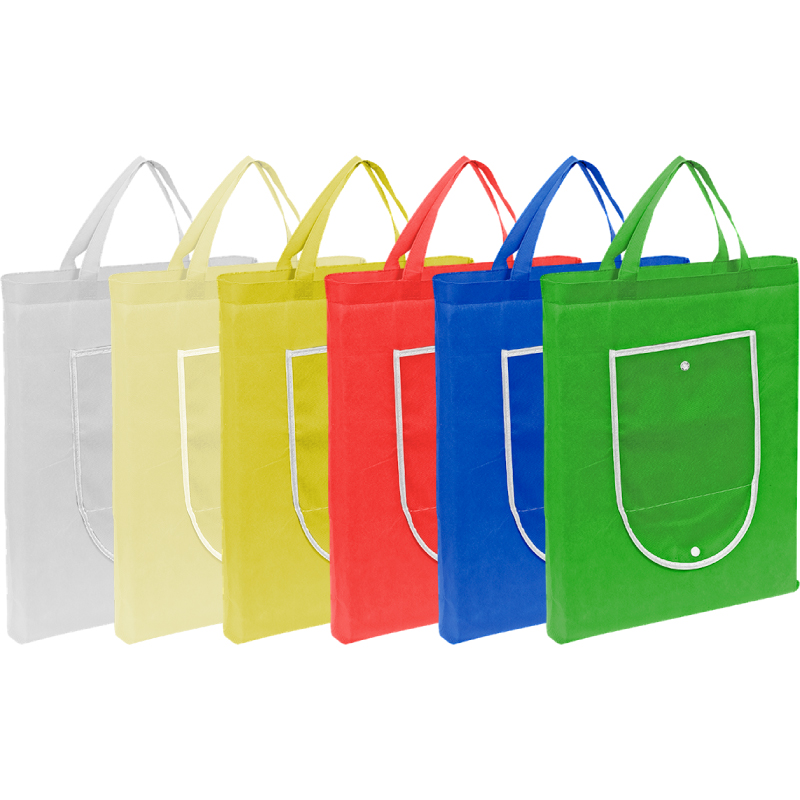 40 x 47.5 cm (abierta) / 20,5 x 12 cm (cerrada)-Non-woven. Bolsa que posee un bolsillo frontal con vivos blancos alrededor y un cierre de botón.