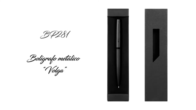 Metálico. Cuerpo color mate. Clip y anillo metálico. En la parte superior destape electroplateado. Apertura giratoria. Tinta negra. Presentación en caja de regalo.