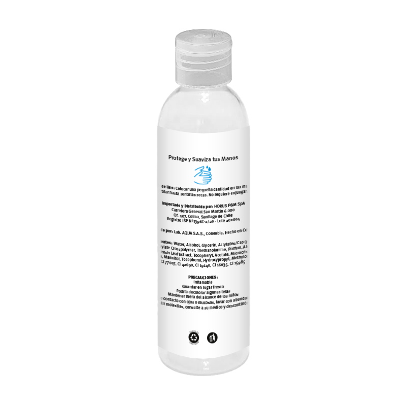 Modo de uso: Aplique pequeñas cantidades en manos, antebrazos y frótese hasta que el producto se seque.