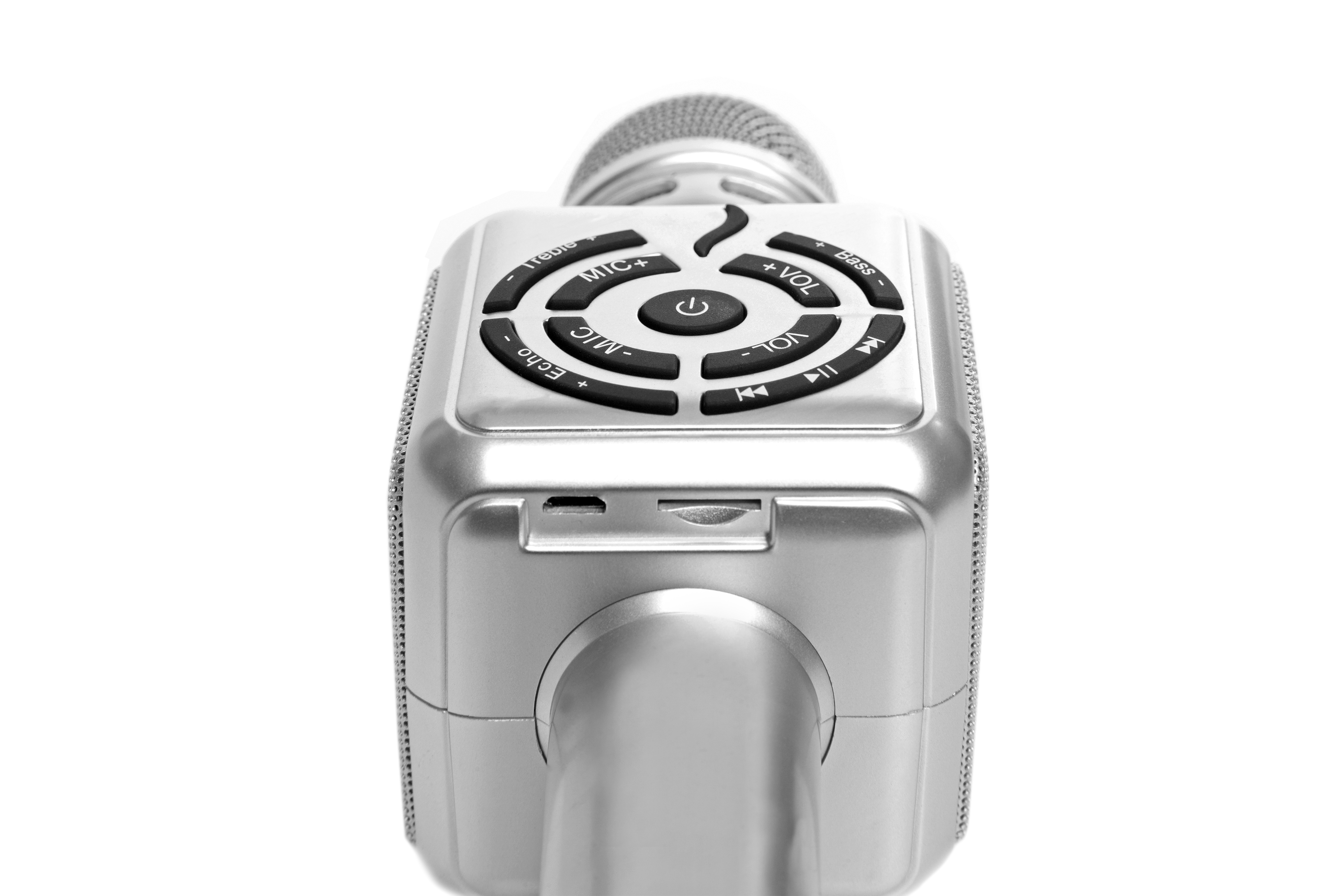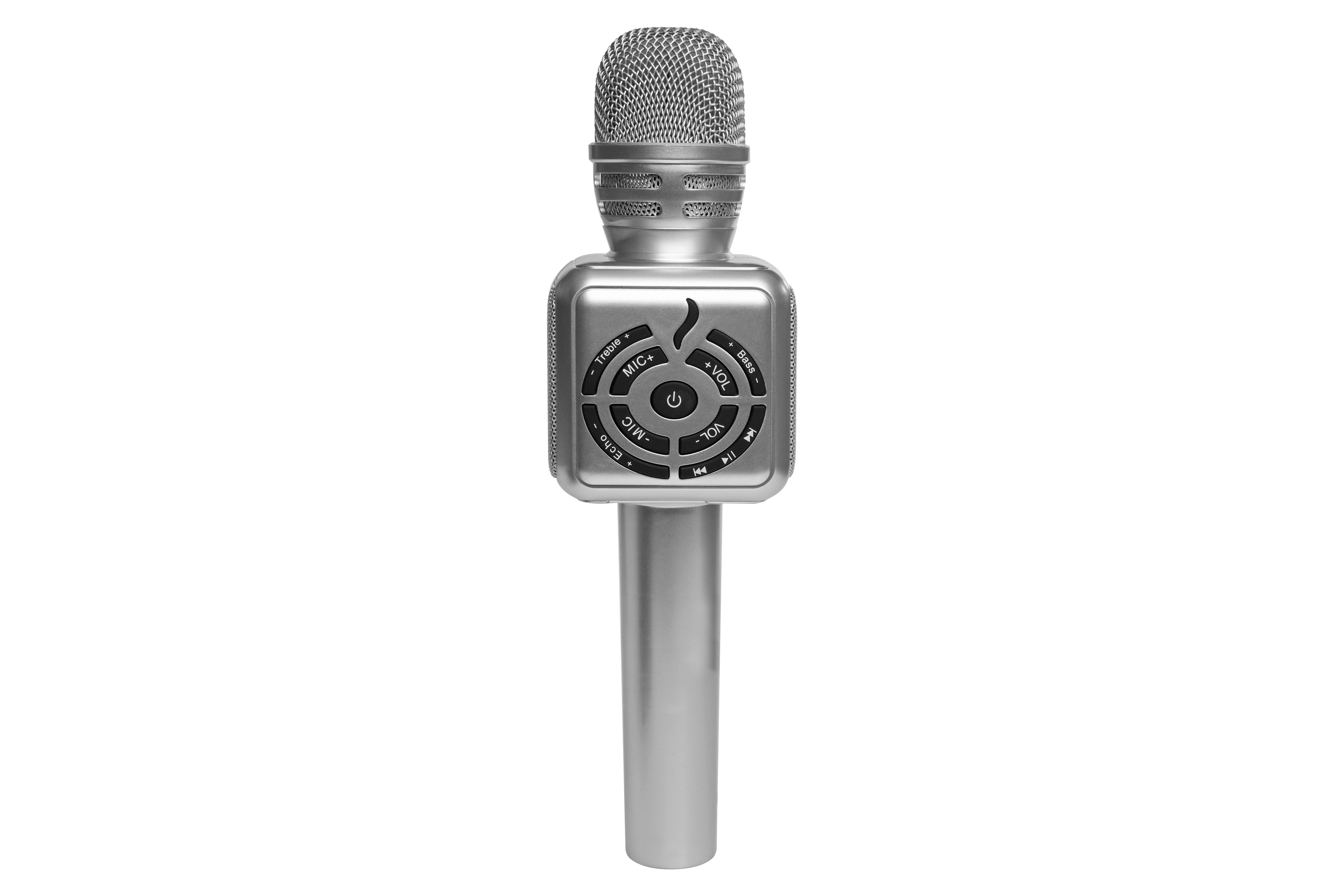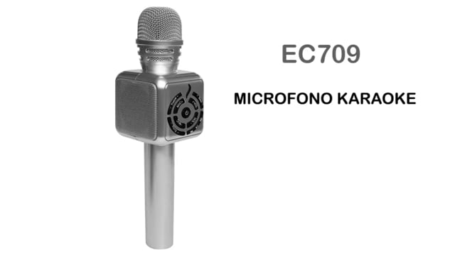 25 x 6,5 cm. Plástico. Microfono Karaoke. Funciones: micrófono que permite seleccionar diferentes tipos de voces presionando el botón de encendido. Funciona como parlante y amplificador de voz. Botón de play, retroceso y avance, volumen, micrófono, triplicador y eco. Presentación en caja de regalo.