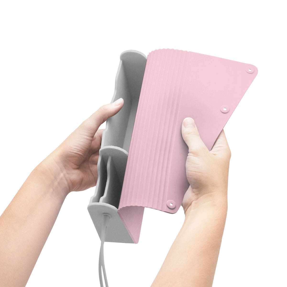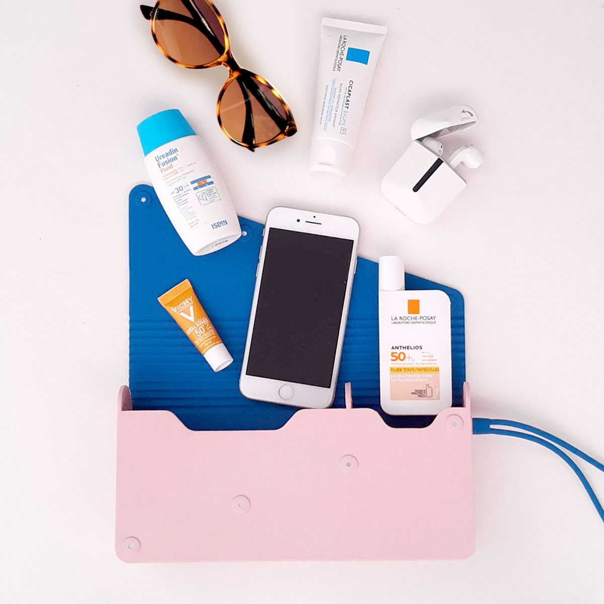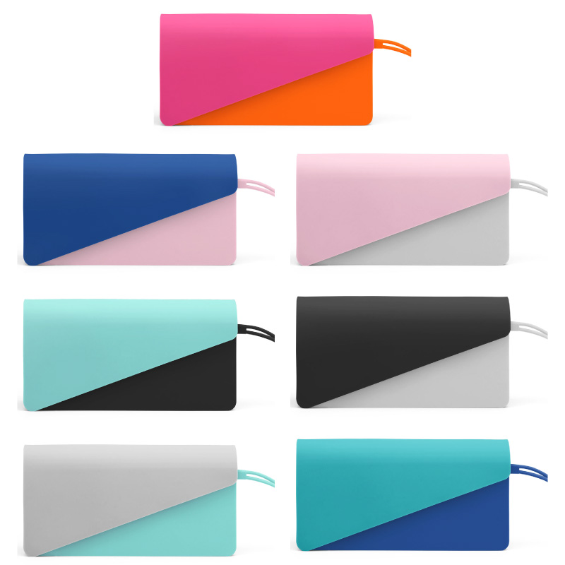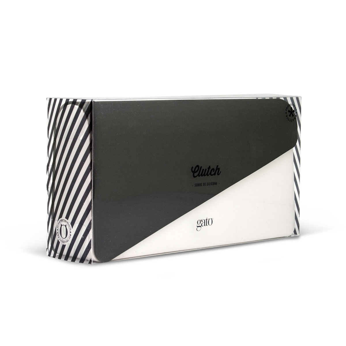 23,5 x 12 x 6,4 cm. Silicona. Sobre de silicona con solapa imantada y correa desmontable. Su interior tiene 3 compartimentos para guardar de todo. Presentación en caja de regalo.