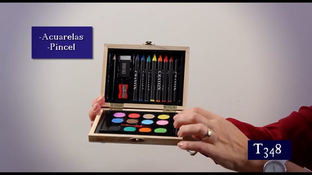 15,6 x 11,6 x 2,9 cm. Set de dibujo en caja de madera. Con acuarelas, crayolas, pincel, lápiz negro, goma y sacapuntas. Presentación en caja de regalo.