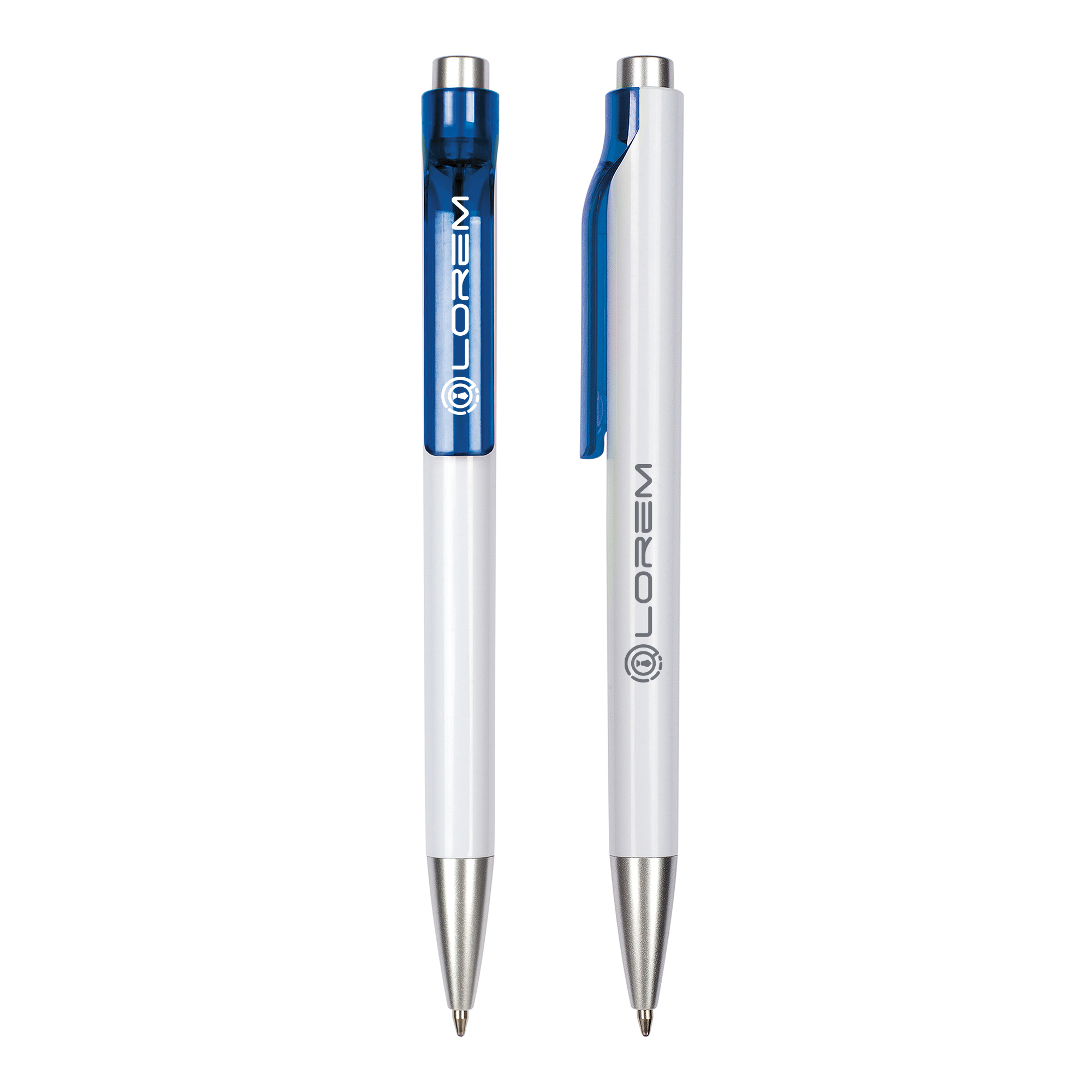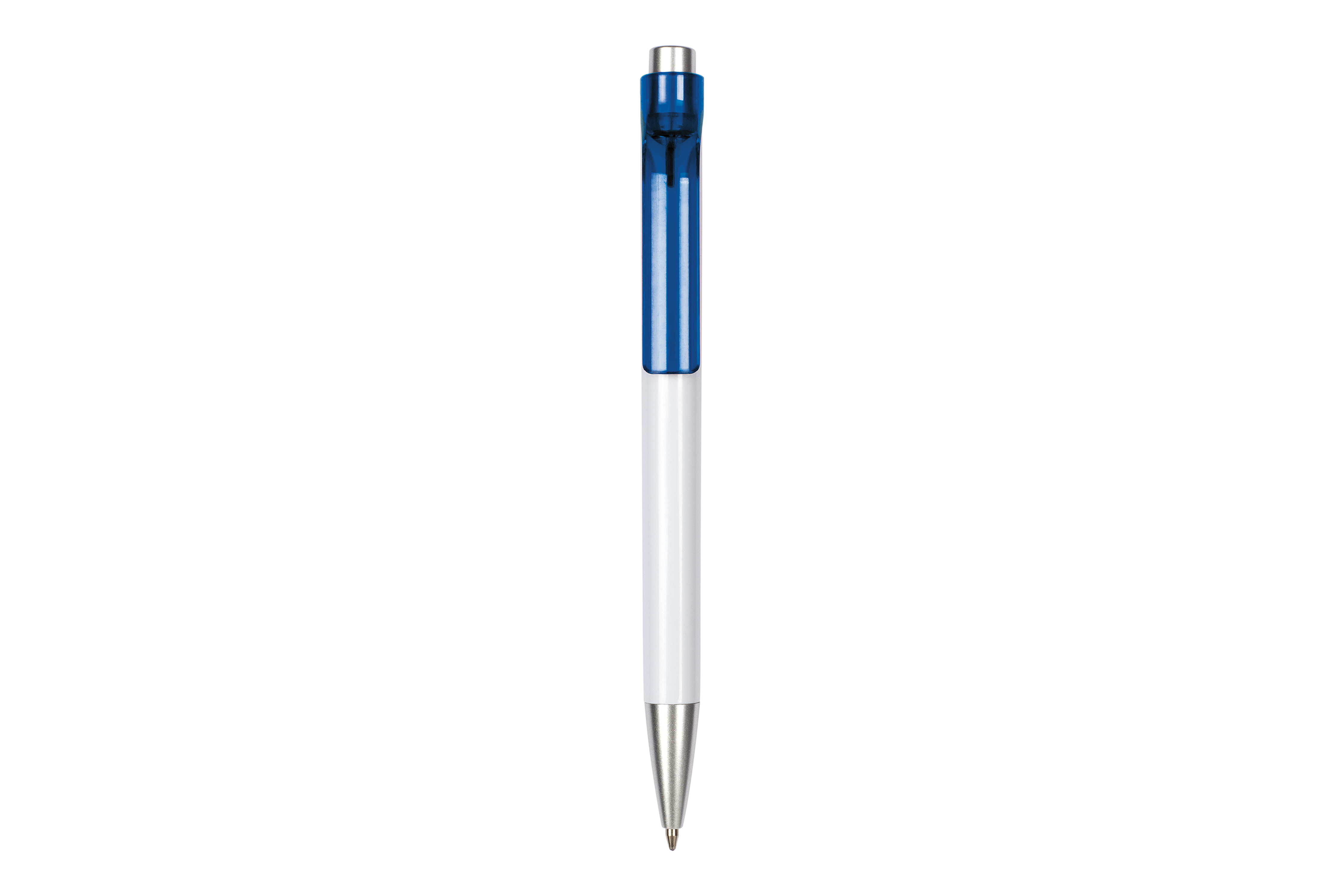 Plástico. Cuerpo blanco. Pulsador y punta color plata. Clip con detalle de color transparente. Tinta azul.