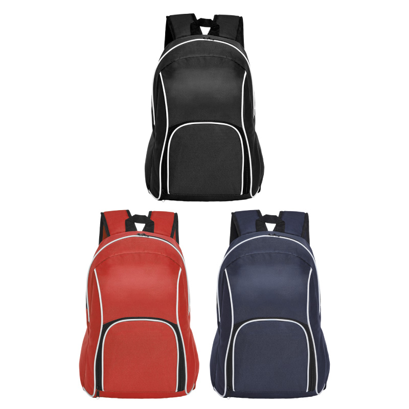 43 x 32 x 13,5 cm. Capacidad 15 litros. Polyester 600D. Mochila con bolsillo frontal en la parte inferior, bordes blancos y parte interna acolchada. Correa ajustable y manillas acolchadas.