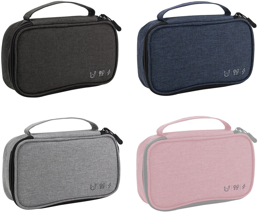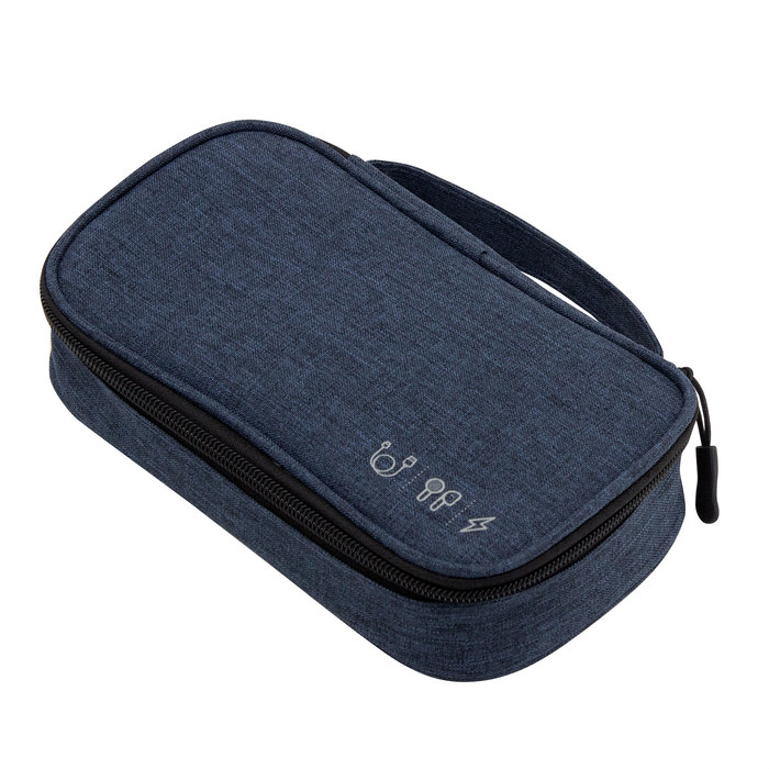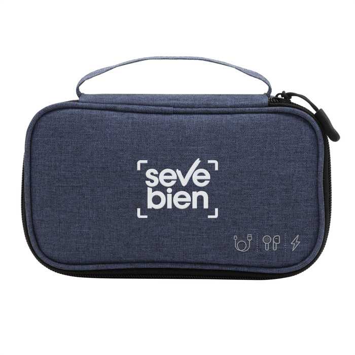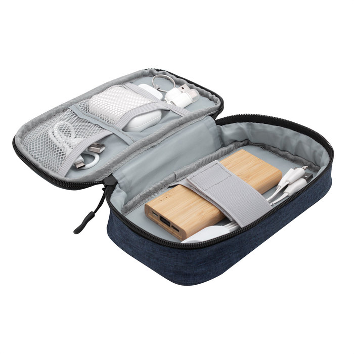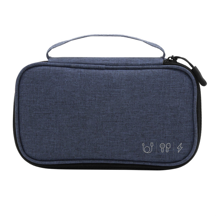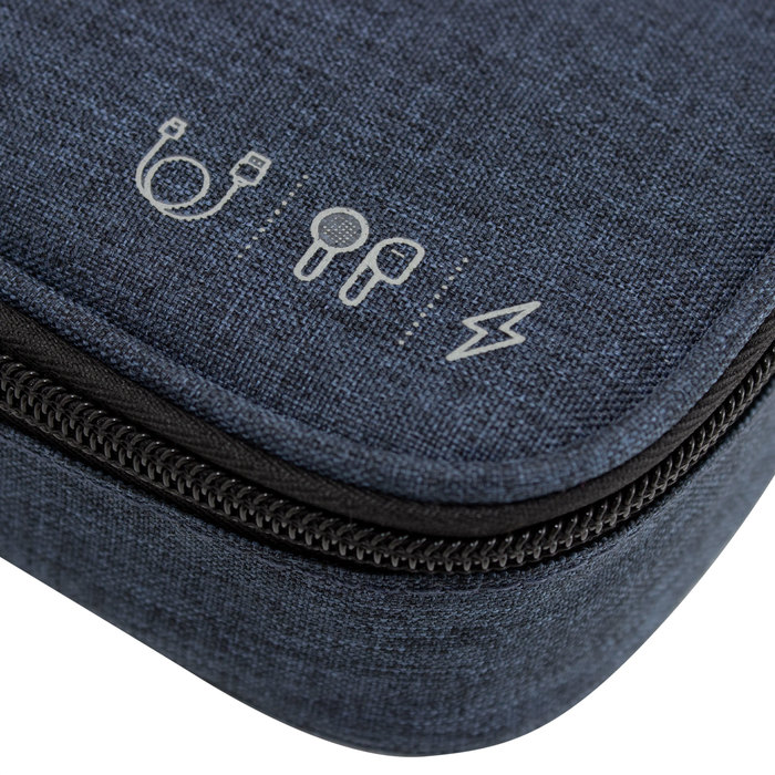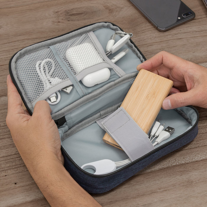 20 x 12 x 5,3 cm. Poliéster 300D. Organizador de cables. Estructura acolchada. Asa para transportar. Compartimento principal con cierre con tirador engomado. Interior forrado. En uno de sus lados cuenta con un bolsillo principal y dos pequeños de red, y en el lado contrario tiene un elástico con velcro multipropósito.