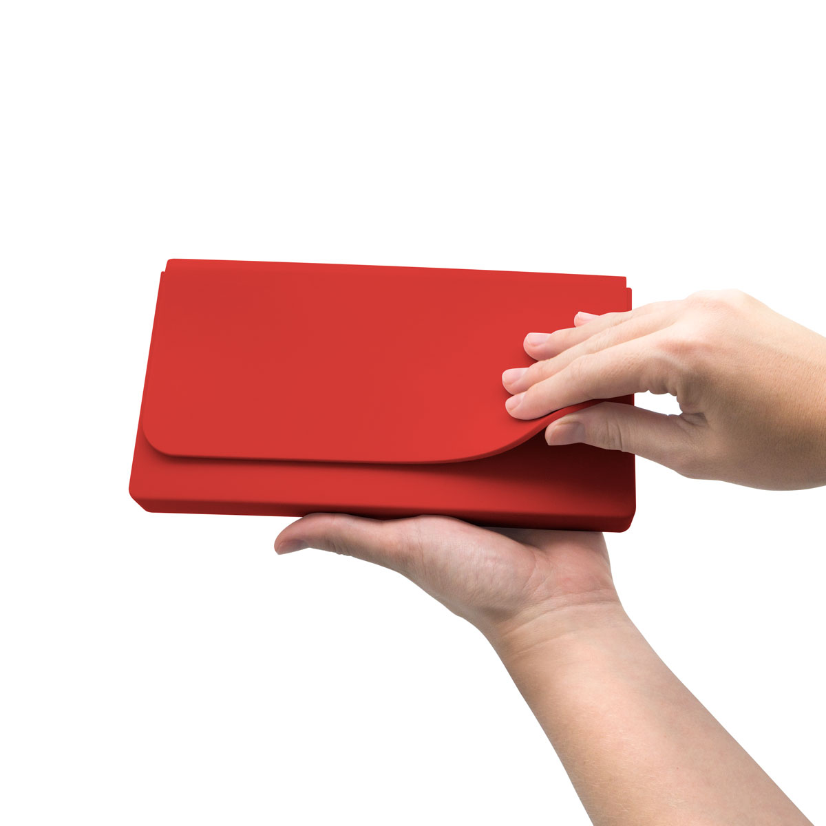 22 x 12 x 2 cm. Silicona. Sobre de silicona. Para llevar documentos, papeles importantes, tarjetas, mapas, los papeles del auto y mucho más. Ideal para viajes. Tapa plegable, 3 compartimentos y cierre con imán. Presentación en caja de regalo.