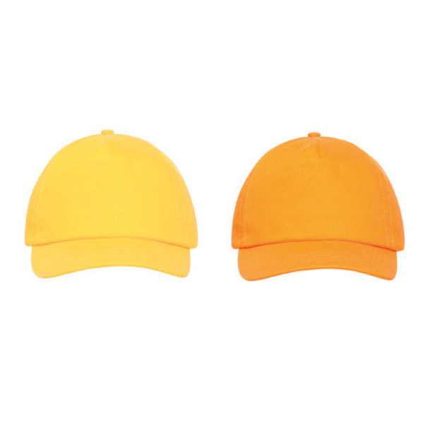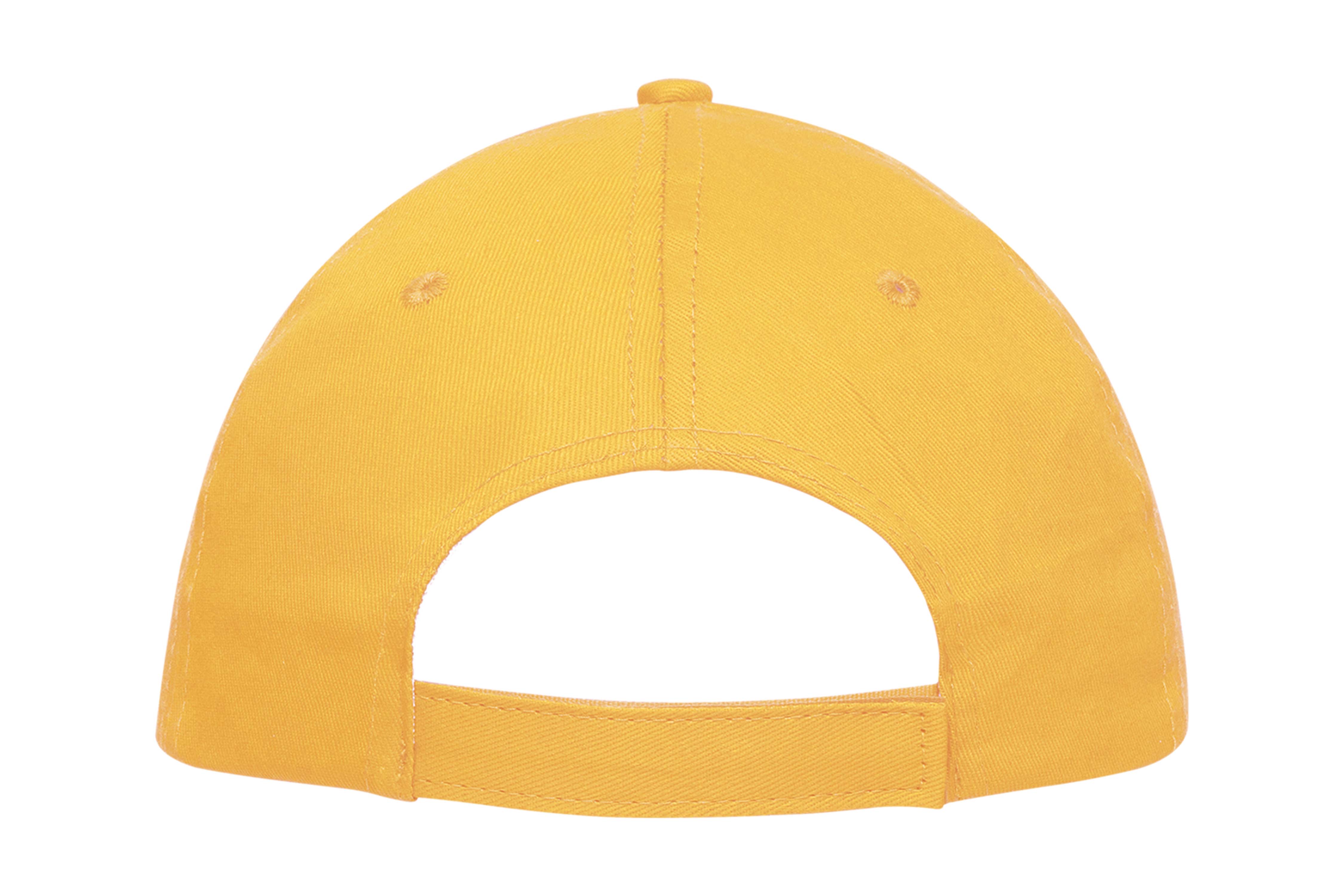 Algodón. 5 paneles con parte frontal reforzada, 2 ojales bordados, botón y cierre ajustable de velcro.