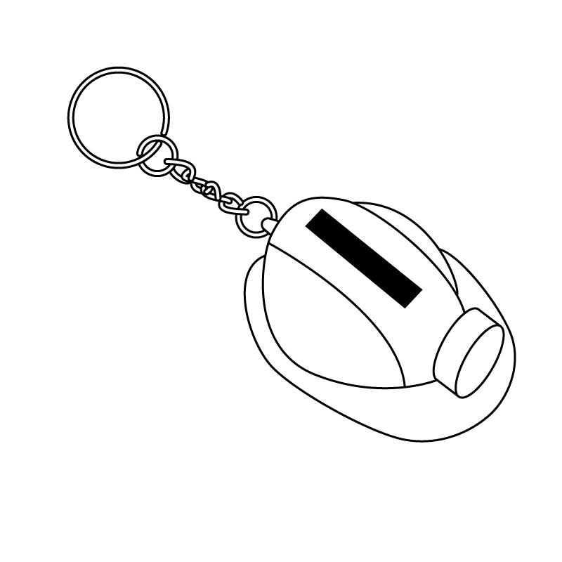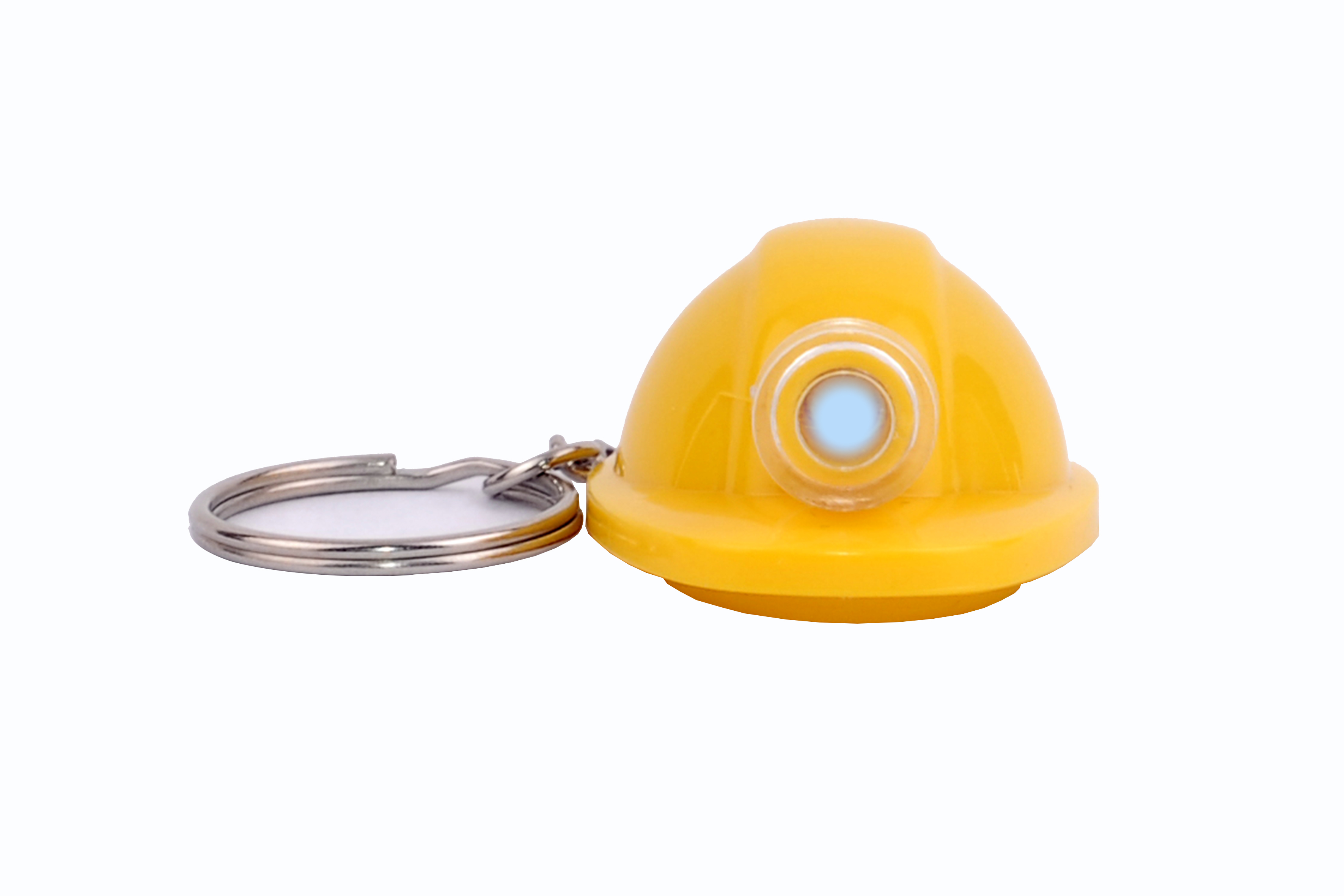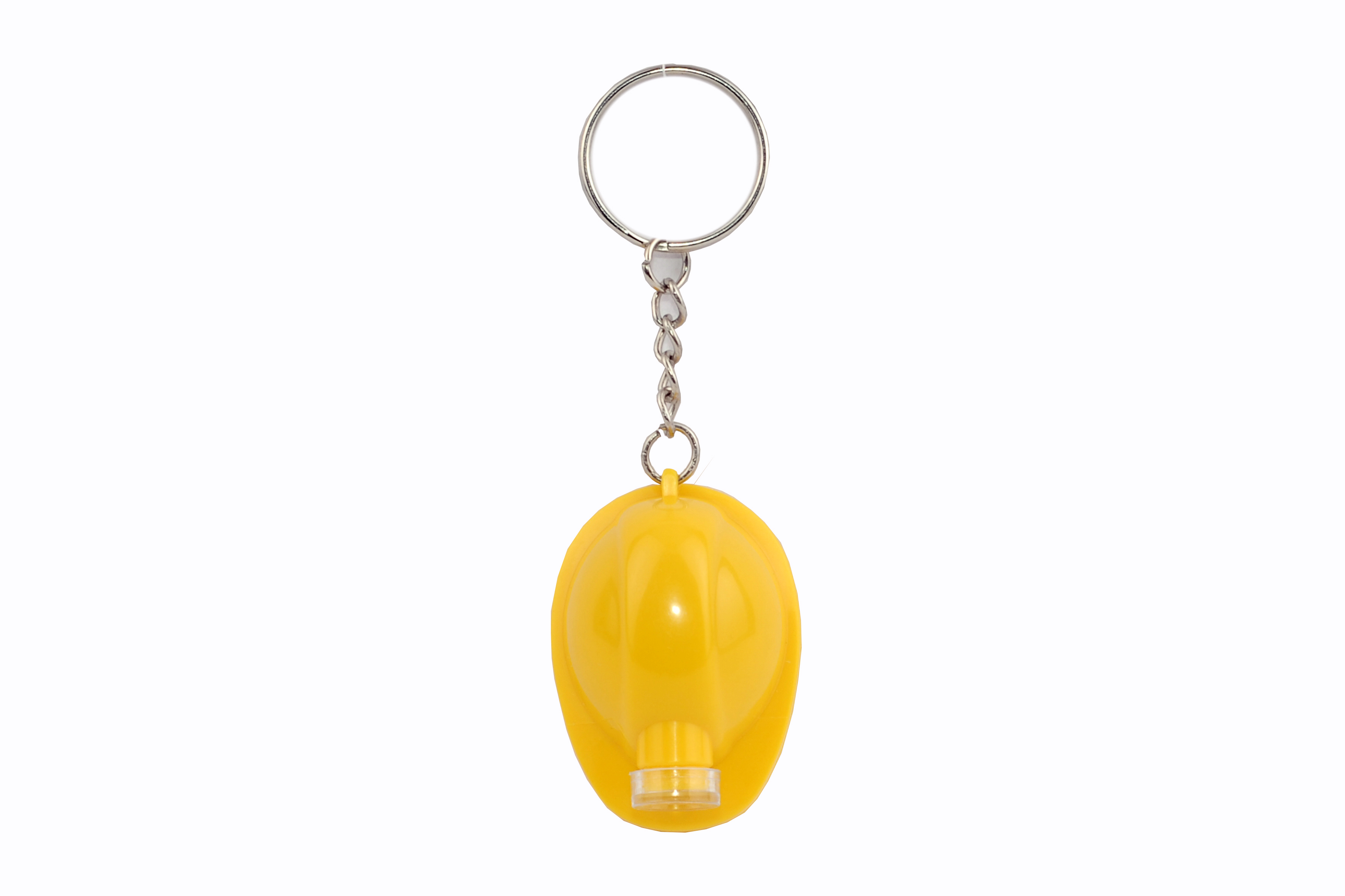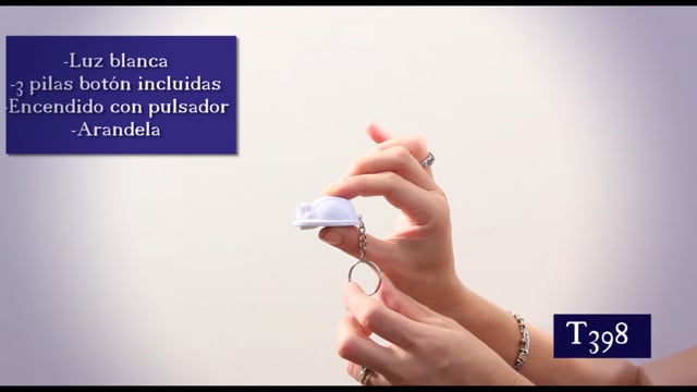 4 x 3 cm. Plástico. Llavero con forma de casco, luz blanca. Encendido con pulsador. Arandela metálica. 3 pilas botón incorporadas.