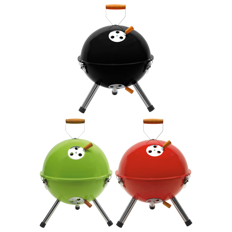 Ø 29 cm. Metal. Barbacoa con dos orificios de ventilación. Tiene un contenedor removible para el carbón, una parrilla, una tapa que cuenta con tres cierres de clip y mango de madera desmontable para facilitar la impresión.
