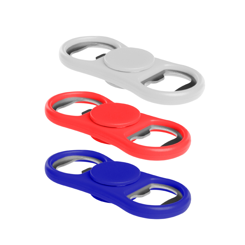8,5 x 3,5 x 1 cm. Plástico y metal. Destapador doble. En el centro tiene un eje para hacerlo girar.