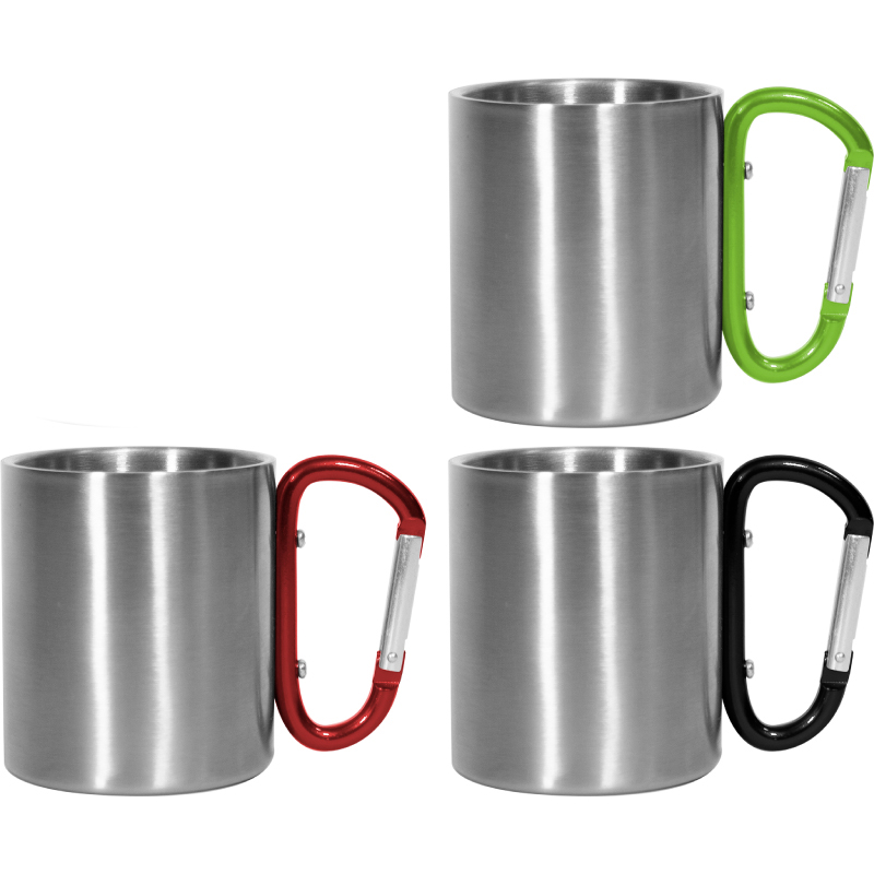 Ø 7 x 7,8 cm. Capacidad 220 ml. Acero inoxidable. Mug doble pared con Mosquetón. Interior de acero 304 y exterior de acero 201. Asa carabinero de aluminio con diferentes opciones de color. Mantiene las bebidas frías y calientes por más tiempo. Te acompaña donde vayas, ideal para camping o cualquier actividad al aire libre.