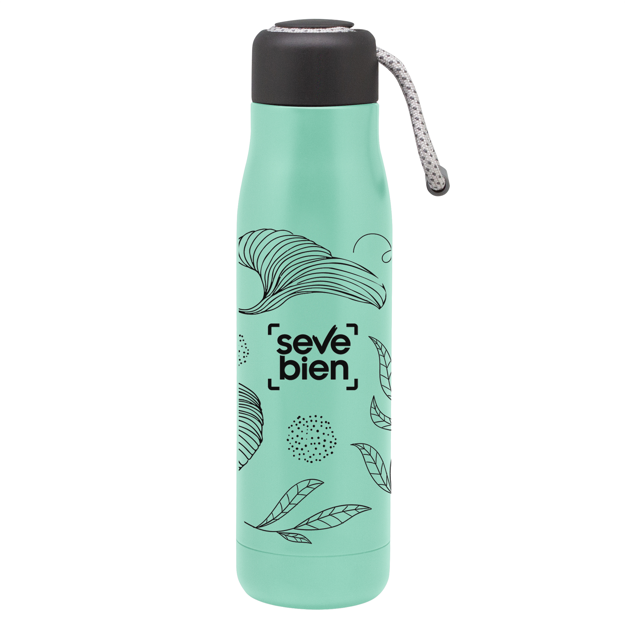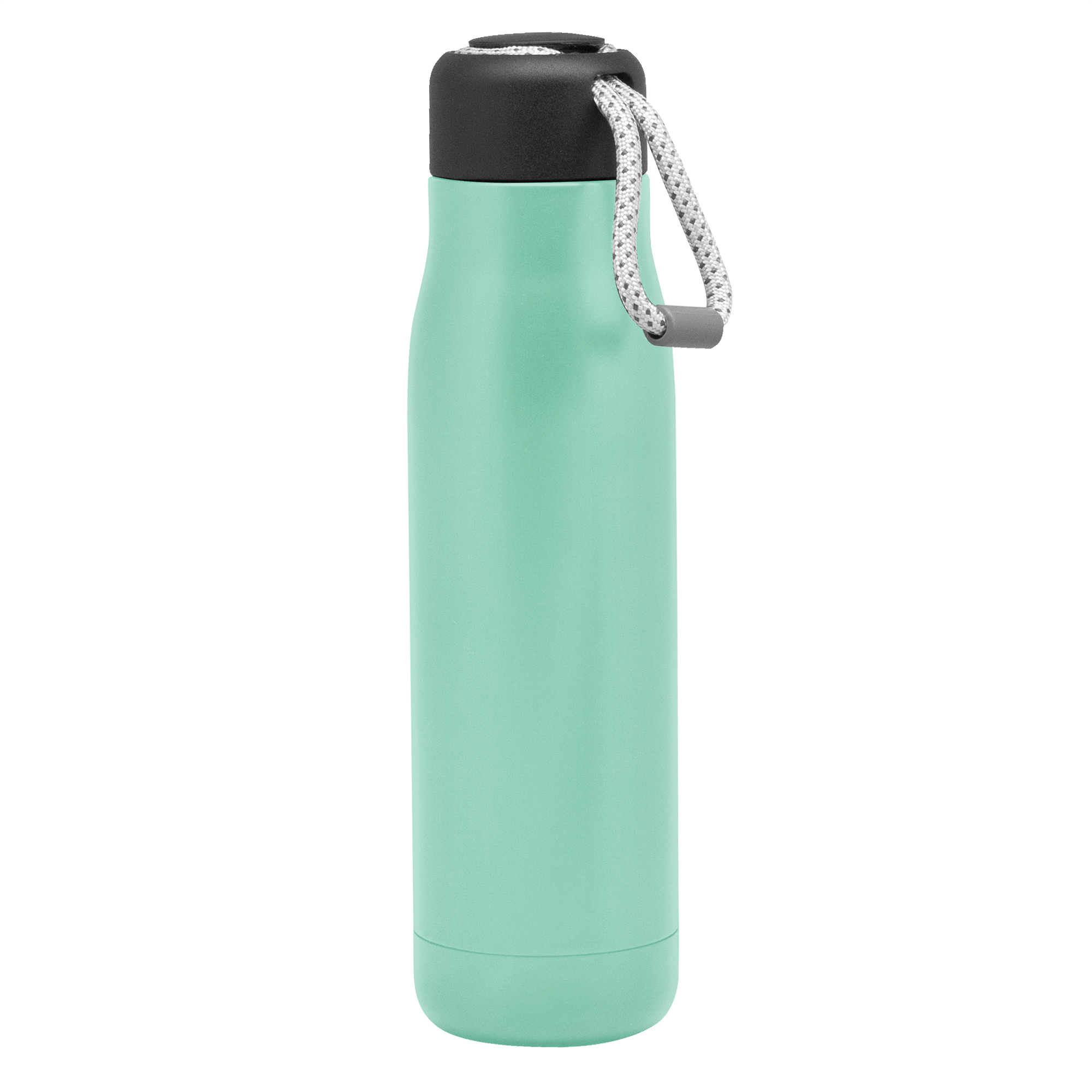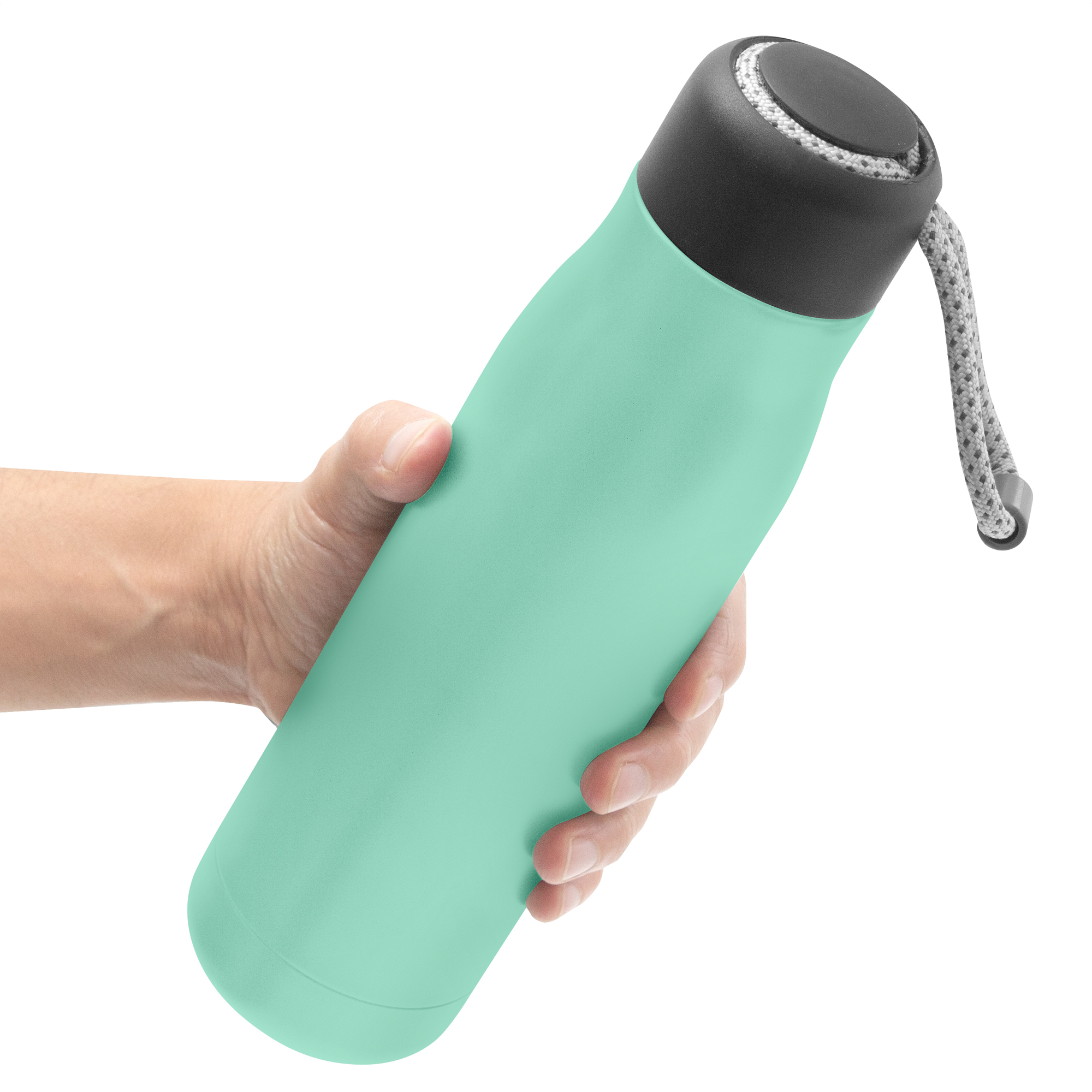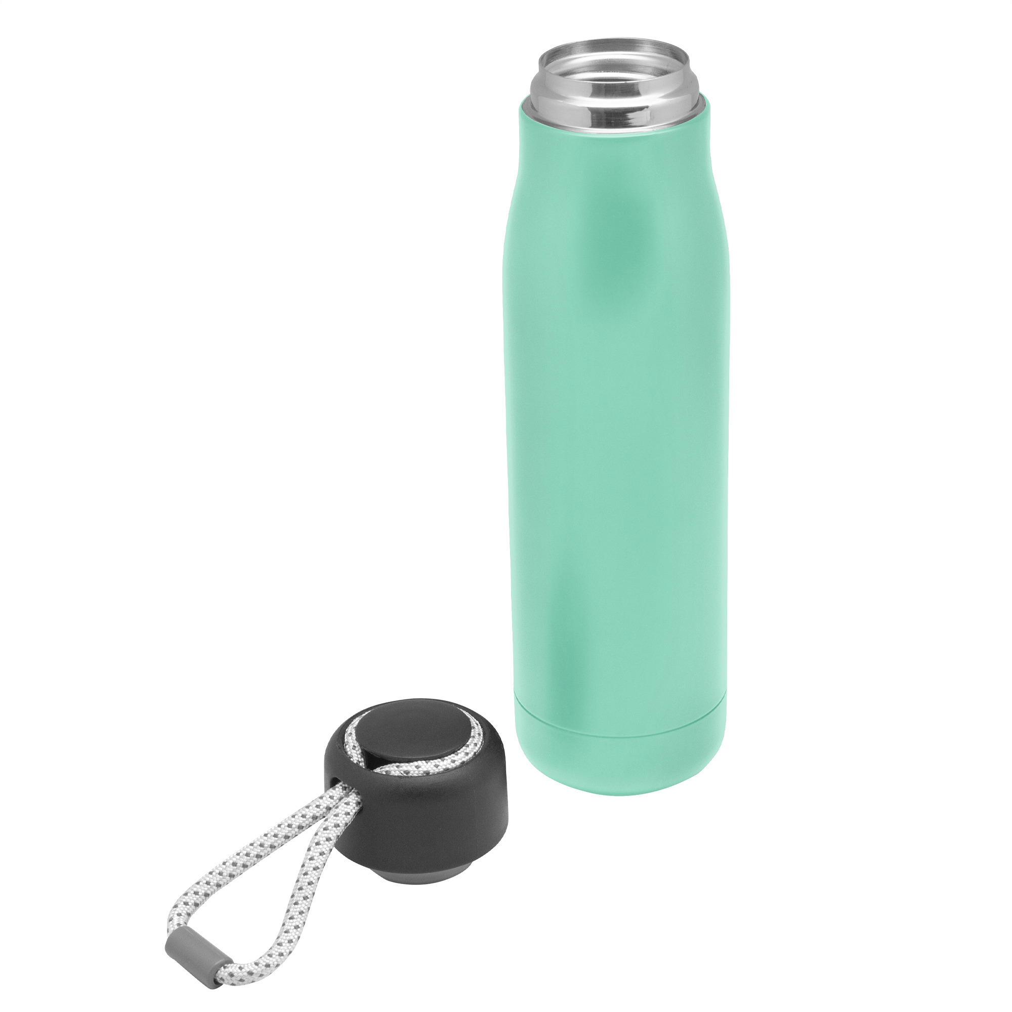 Botella doble pared, sellada al vacío. Interior de acero 304 y exterior de acero 201. Tapa plástica de polipropileno y anillo de silicona. Posee además tira de color gris de 12 cm de largo. Ideal para llevarla a todos lados. Mantiene hasta 12 hs la temperatura de las bebidas calientes y 24 hs de las bebidas frías.