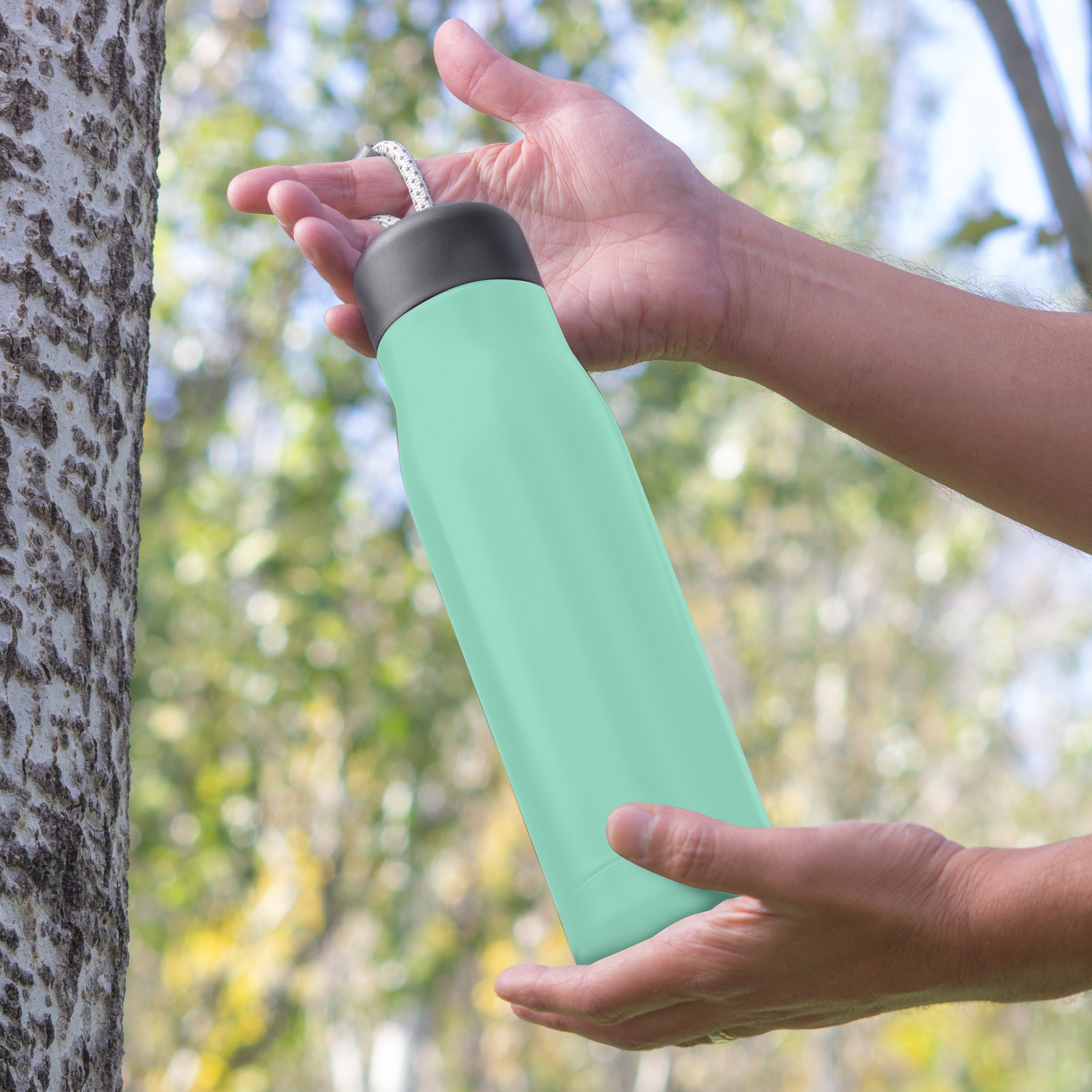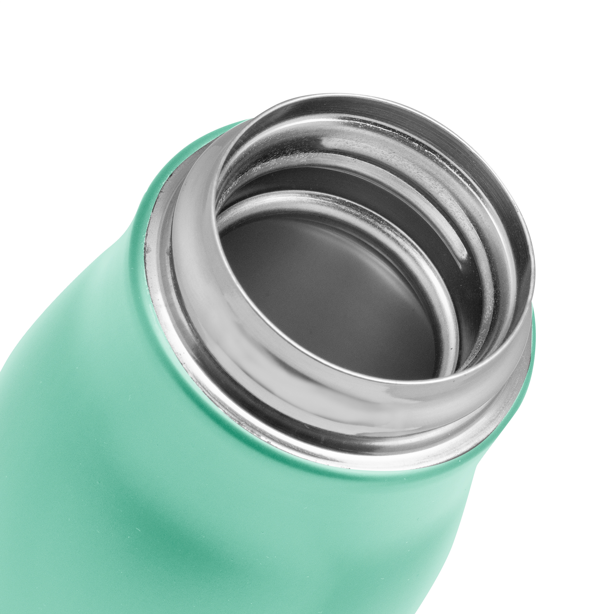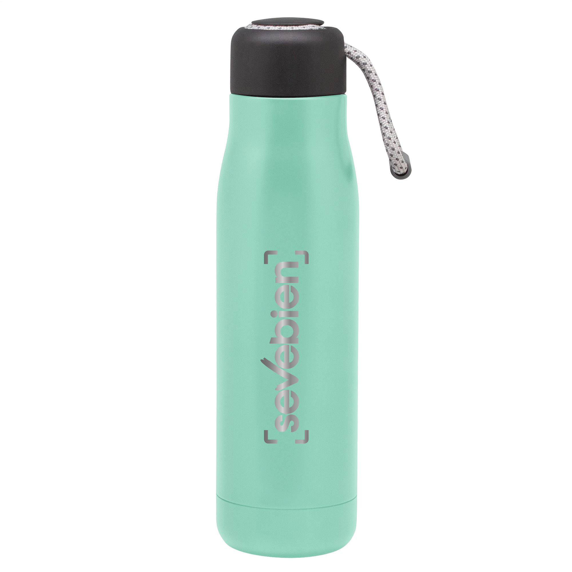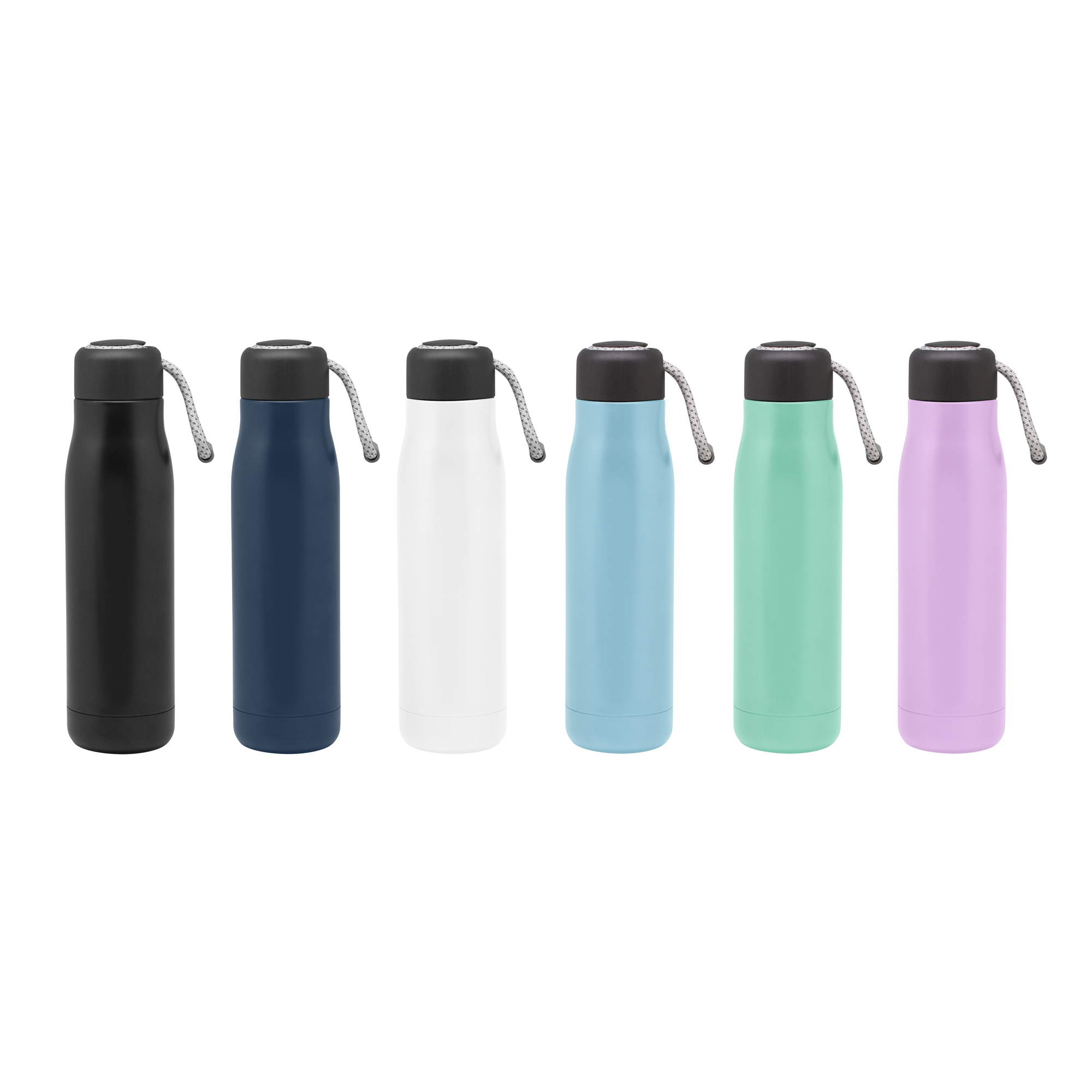 Botella doble pared, sellada al vacío. Interior de acero 304 y exterior de acero 201. Tapa plástica de polipropileno y anillo de silicona. Posee además tira de color gris de 12 cm de largo. Ideal para llevarla a todos lados. Mantiene hasta 12 hs la temperatura de las bebidas calientes y 24 hs de las bebidas frías.
