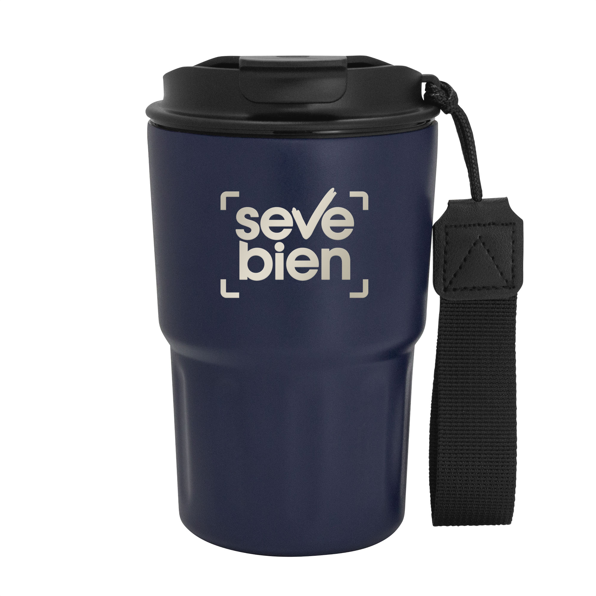 Mug doble pared, sellado al vacío. Mug con aislamiento térmico. Tecnología vacuum. Interior en acero 304 y exterior en acero 201. Tapa de polipropileno con anillo de silicona y correa de poliéster en color negro. Pintura acabado mate. Mantiene por más de 12 hs la temperatura de las bebidas calientes y 24 hs de las bebidas frías.