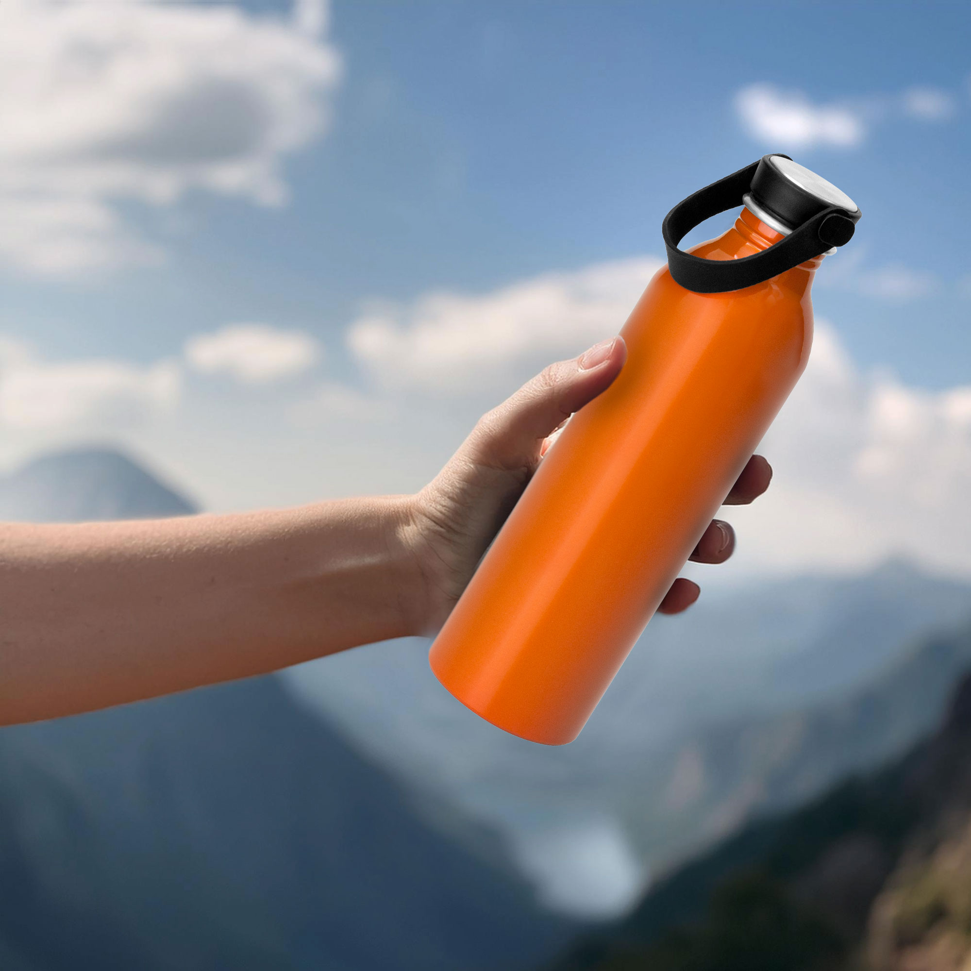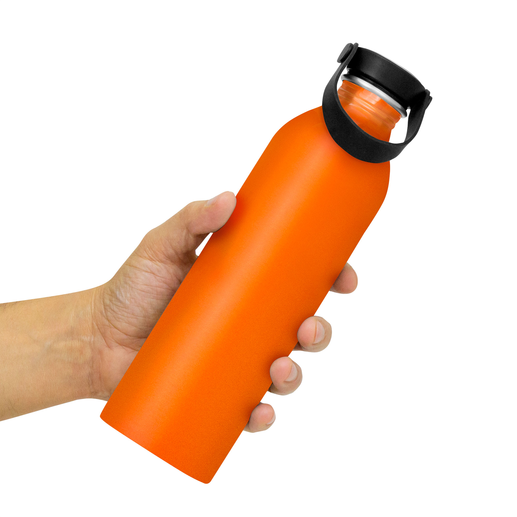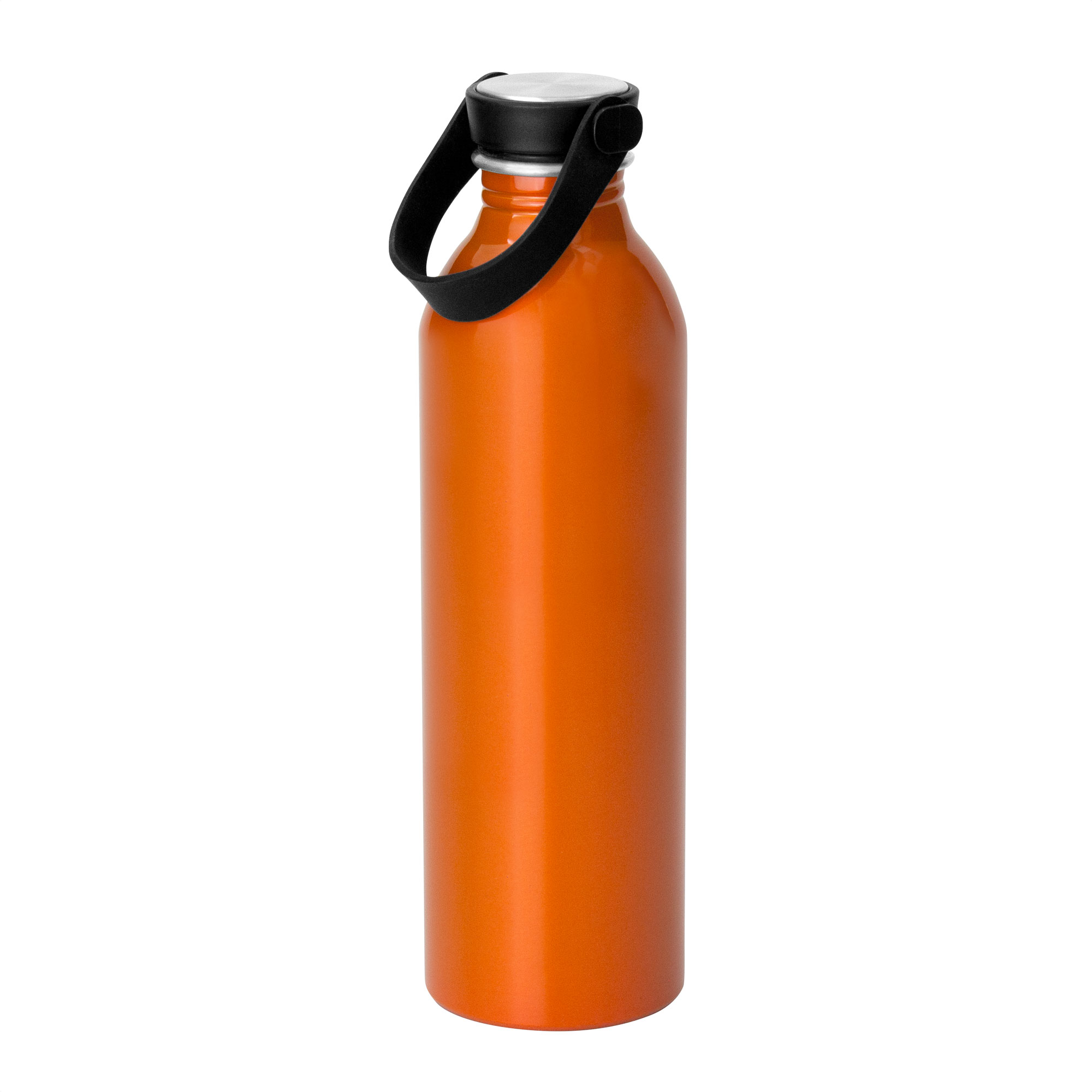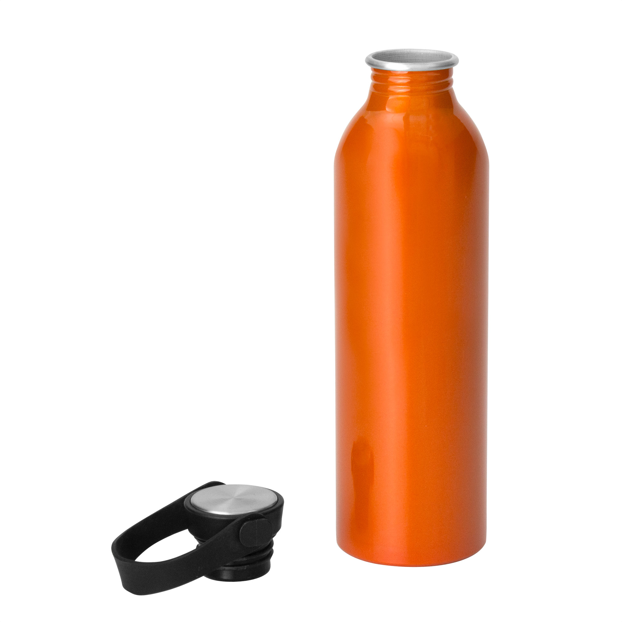 Botella de aluminio con acabado brillante. Tapa a rosca de acero inoxidable 201 y Polipropileno, con tira de silicona color negro.