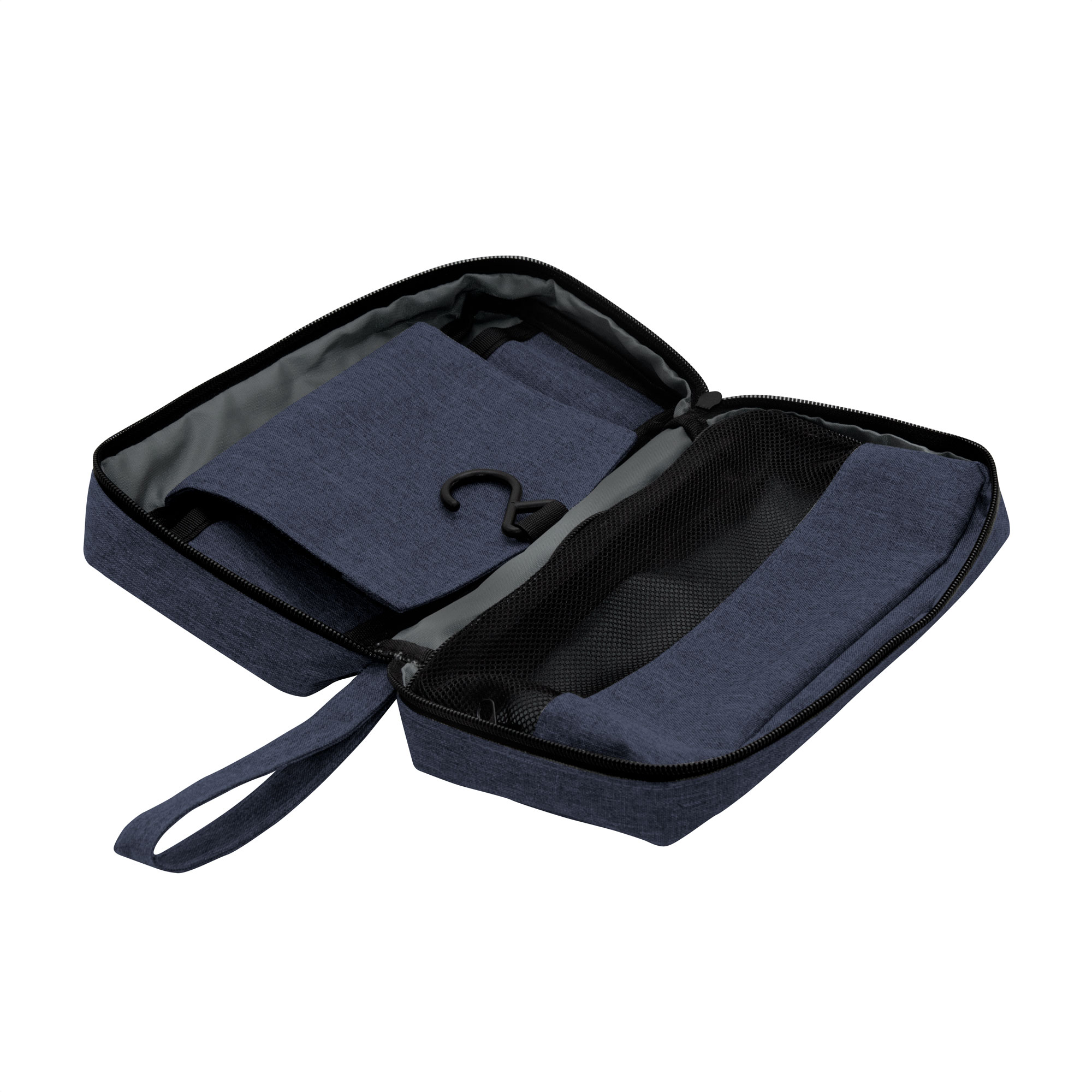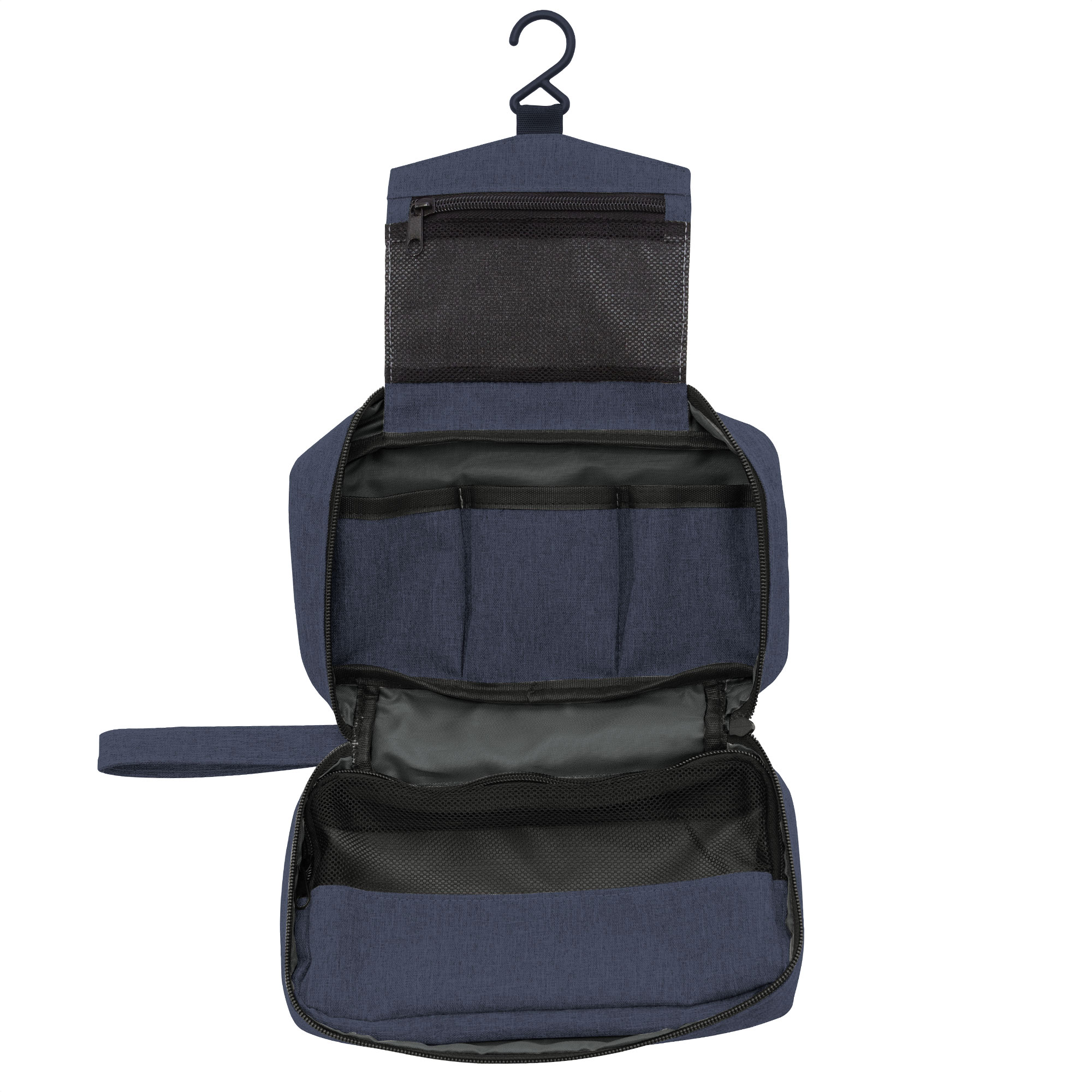 Necessaire colgante. Compartimento principal con cierre y asa de tela para transportar. Interior: compartimento superior rebatible con gancho para colgar y bolsillo de red con cierre, compartimento central con 3 bolsillos y amplio compartimento inferior con ventana de red y cierre.