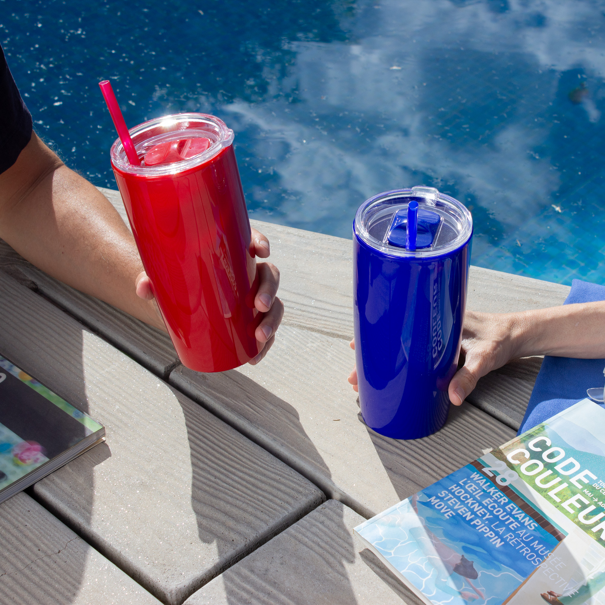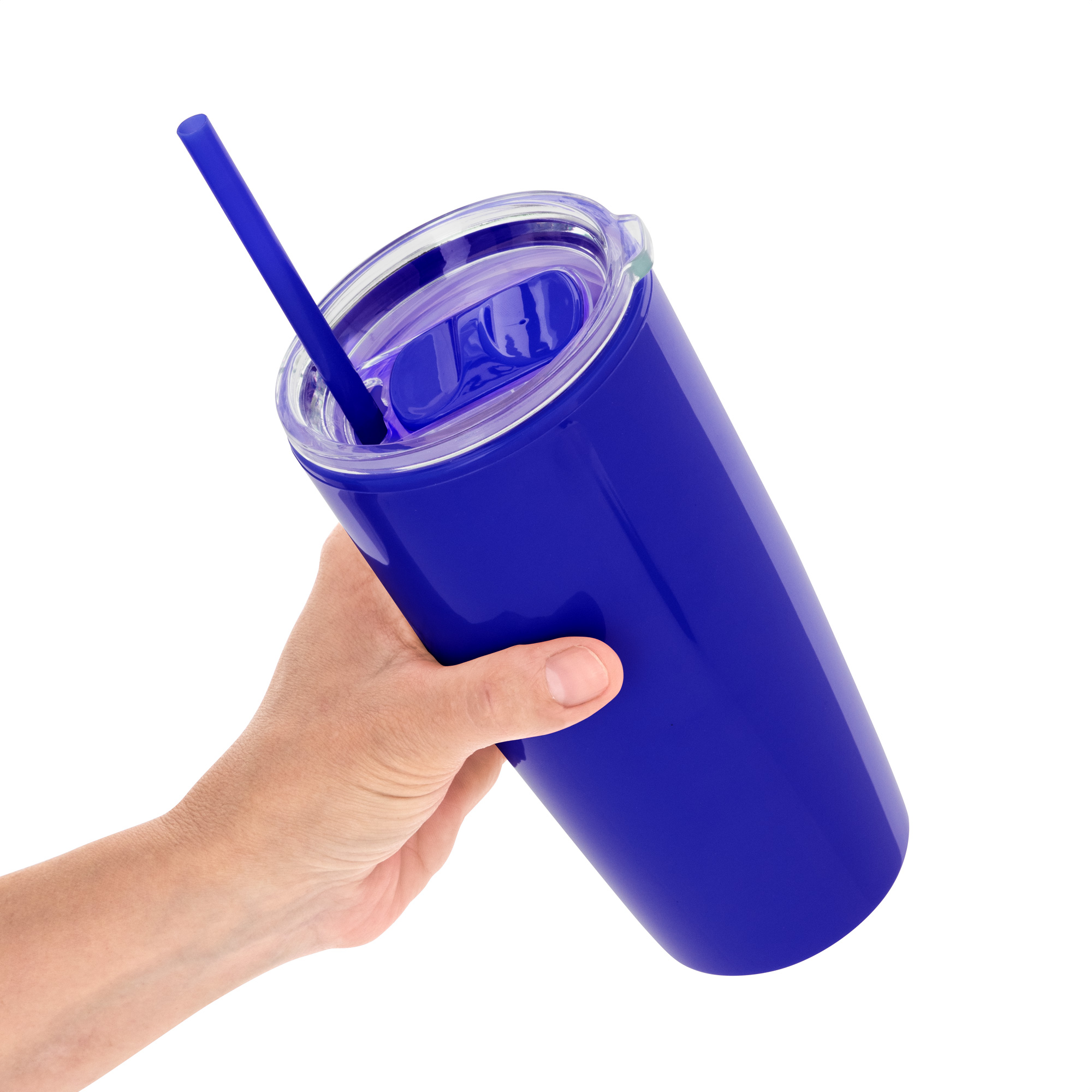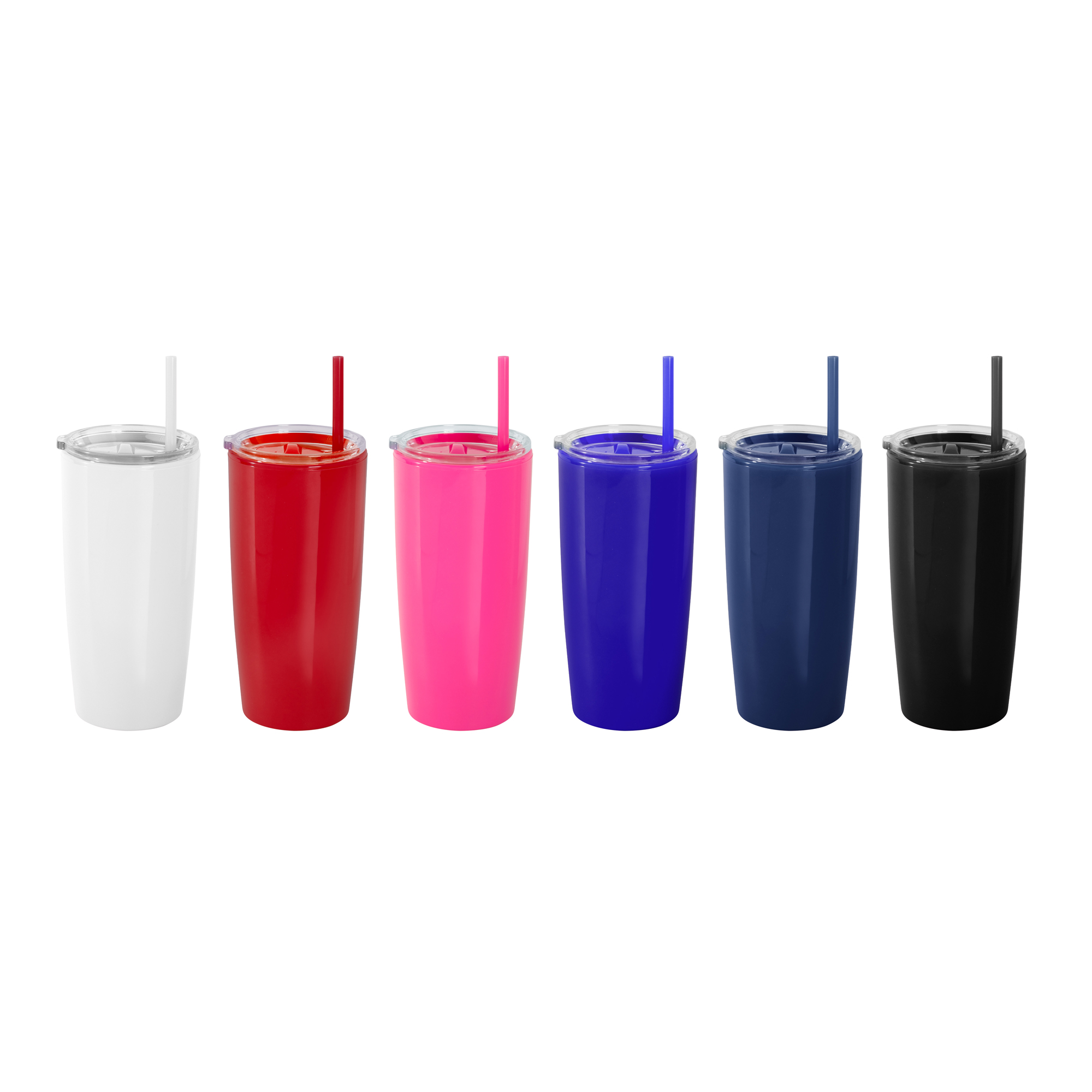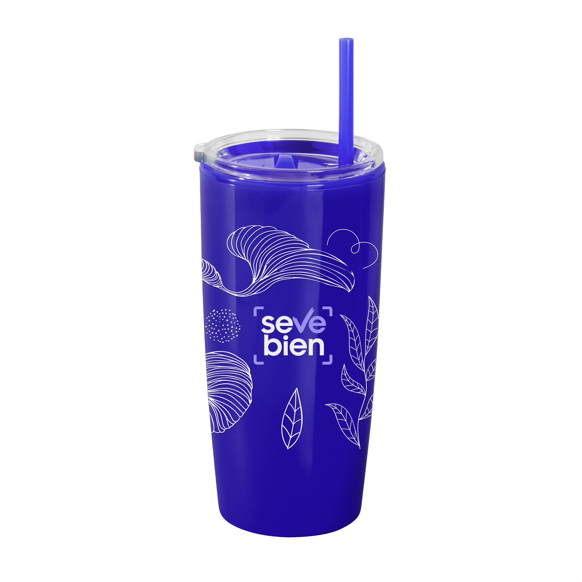 Mug doble pared con sorbete. Tapa plástica transparente a presión con anillo de silicona. Sorbete de polipropileno y cierre deslizante del mismo color que el cuerpo. Cuerpo con acabado brillante.