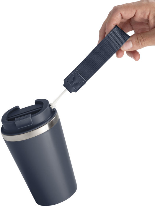 Mug doble pared con asa colgante. Interior de acero inoxidable 304 y exterior de Polipropileno con acabado mate. Tapa a rosca de polipropileno con anillo de silicona y seguro antiderrame del mismo color del mug. Asa de poliuretano y poliéster.